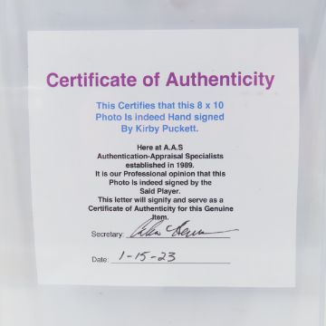 Kirby Puckett Signed Ross Cunningham Photocard -8x10 with COA Please ask questions and read terms & conditions before bidding.