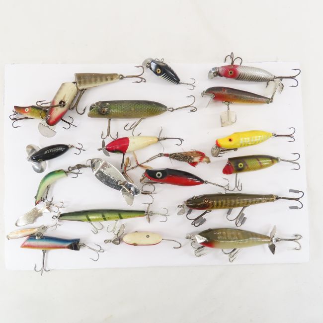 21 Vintage Fishing Lures Jitterbug, Flash-Oreno -Heddon & more Please ask questions and read terms & conditions before bidding.