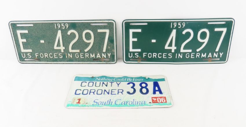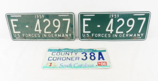 3 License Plates, US Forces in Germany, Coroner - Please ask questions and read terms & conditions before bidding.
