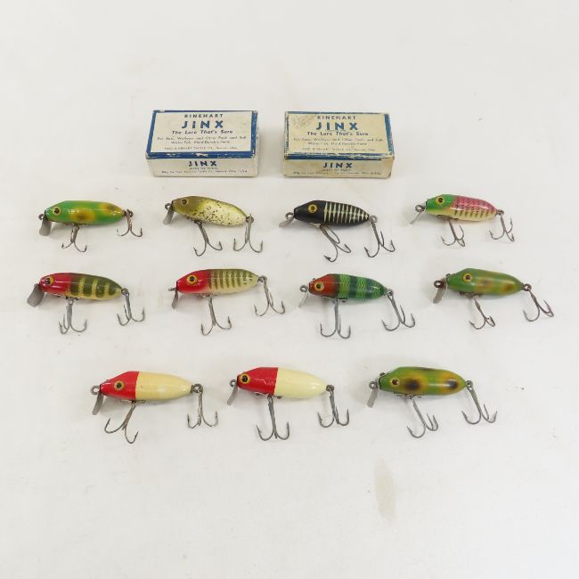 11 Vintage Rinehart Jinx Lures & 2 Boxes - Please ask questions and read terms & conditions before bidding.
