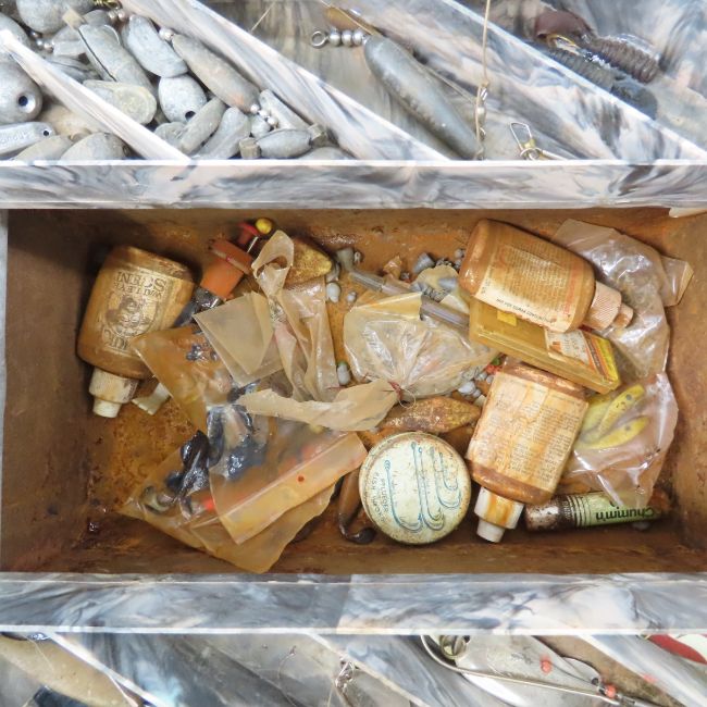 Plastic & Metal Tackle Boxes, Plugs, Spoons & more -4 Plastic Tackle Boxes, 1 Metal Tackle Box, 1 Cigar Box, & Small Metal Box, Most Boxes have a Few Lures, Metal Box Has Heavy Rust & Missing Handle Please ask questions and read terms & conditions before bidding.