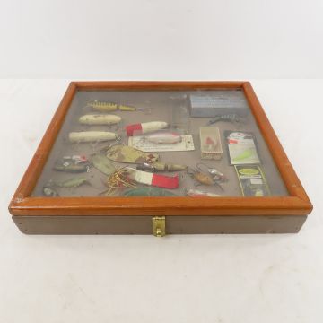 Vintage fishing lures in display case - Please ask questions and read terms & conditions before bidding.