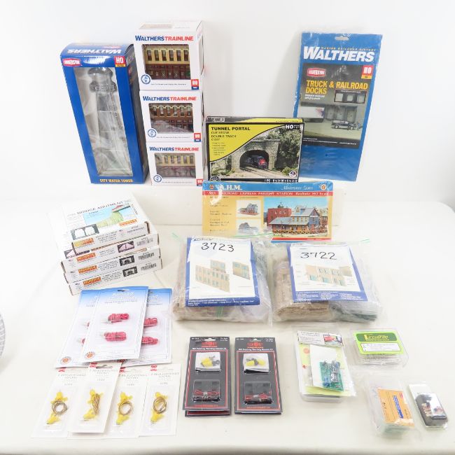 10 Walthers HO Scale Train Model Kits and More - 2x Monroe #151 Tunnel Portal, #703 Wing Walls, #104 Bridge Abutment, Woodland Scenics C1257 Tunnel Portal, Walthers 933-2825 City Water Tower, 2x Walthers 931-812 Midtown Hardware, Walthers 931-806 Gemeni Building,AHM 5831 Railroad Express Freight Station (sealed), Walthers 933-4070 Dock Doors (sealed), 3722 & 3723 Modulars, Walls and Windows and More Please ask questions and read terms & condition before bidding.