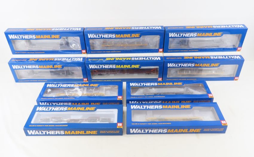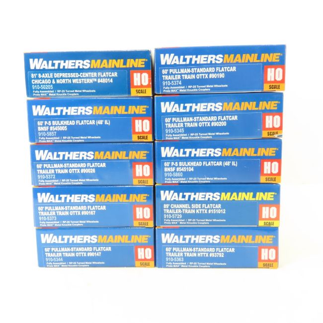 10 Walthers Mainline HO Train Cars NIP - 910-5860, 910-5729, 910-5857, 910-5344, 910-5374, 910-5345, 910-5363, 910-5372, 910-5373, 910-50205 - Pullman Flatcars, Bulkhead Flatcar, KTTX, OTTX, HTTX, All NIB Please ask questions and read terms & condition before bidding.
