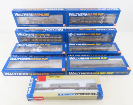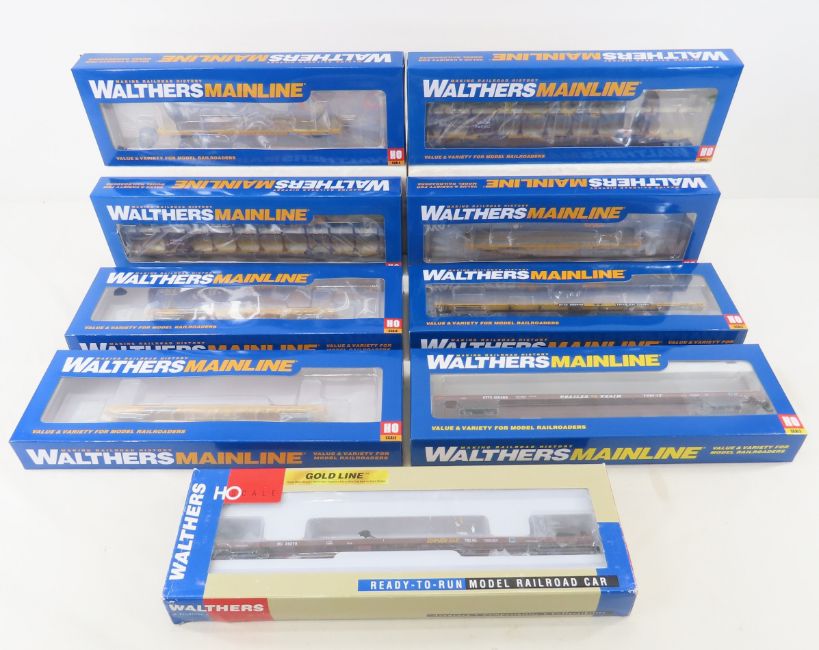 9 Walthers Mainline HO Train Cars NIP - 910-5366 Flatcar, 910-5364 Pullman Flatcar, 910-8025 Bi-Level Auto Rack, 910-5365 Flatcar, 910-5460 G85 Flatcar, 910-8026 Bi-Level Auto Rack, 910-5371 Flatcar, 910-5728 Side Flatcar, Gold Line 932-40815Flatcar with ACF Hitches Please ask questions and read terms & condition before bidding.
