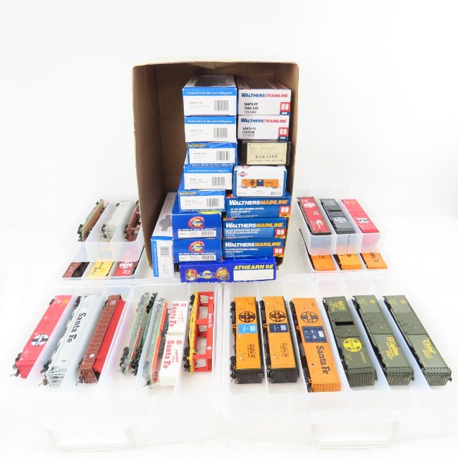 27 ATSF HO Rolling Stock & 16 Boxes - cars are in plastic case and may have broken or missing pieces, with 16 matched boxes Please ask questions and read terms & conditions before bidding.