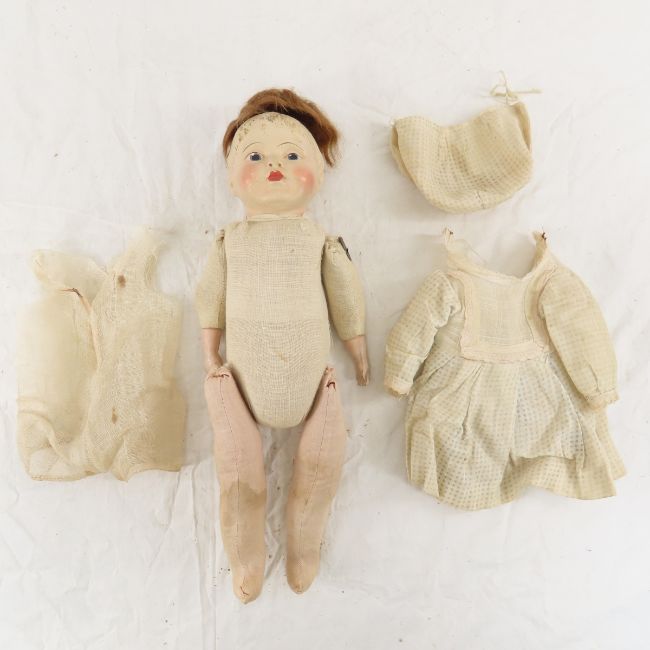 3 Antique Metal Head Dolls & 1 Shoulder Head - 1) 15" metal head -paint peeling,hair wig, glass eyes- cloth body & leather body 2) 18" metal head-marked "Germany 6", open mouth with teeth, painted blond hair, leather & cloth body, on leg is separating at knee and hip joint has lost 1 screw 3) 15" metal head doll unmarked, cloth body & legs, compo hands 4) loose 3" "Germany" metal head, clothes are stained and in rough shape. Thishas been in storage the last 20 years wrapped in paper. Please ask questions and read terms & conditions before bidding.