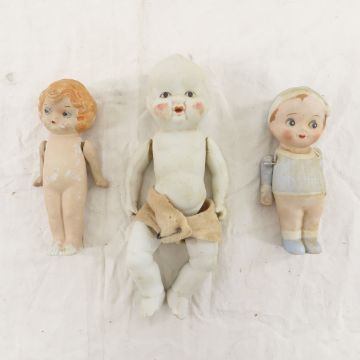 Antique & Japan Small Bisque & Penny Dolls - 1) 4" all porcelain doll marked "Germany 520/11"- jointed arms 2) unmarked 4" doll, jointed arms & leg 3) 7" marked "JAPAN", jointed arms and legs 4) 3.5" doll marked "Made in Occupied Japan", jointed arms and legs 5) 5" googly eye blonde doll marked "Made in occupied Japan", jointed arms 6) 5" googly eye doll with painted clothes marked "Made Japan", jointed arms7) 3" boy doll in swimsuit, jointed arms 8) Kewpie doll figure- "Made in Japan " sticker 9) 4 penny dolls This has been in storage the last 20 yearswrapped in paper. Please ask questions and read terms & conditions before bidding.