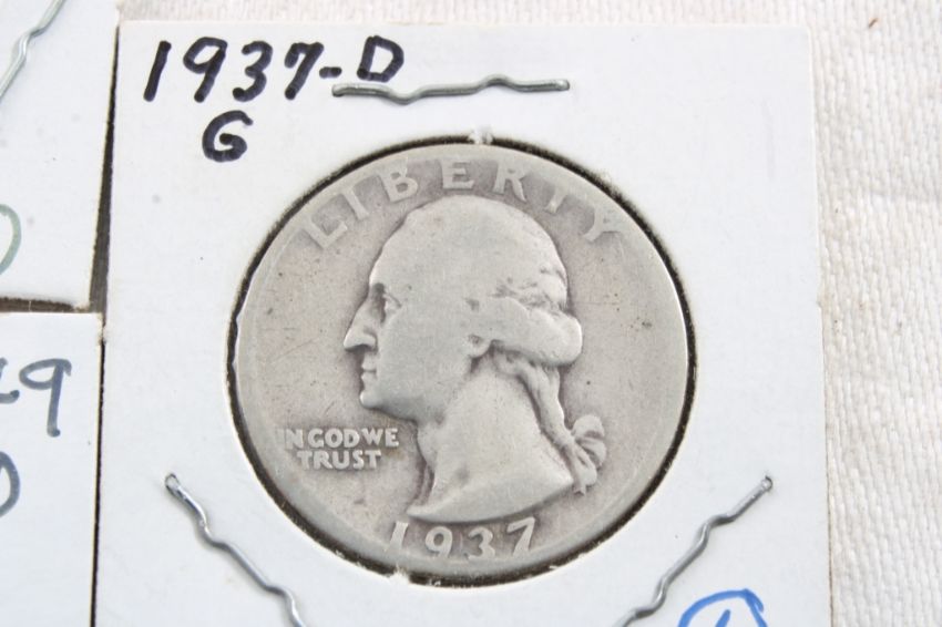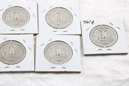 5 Washington Silver Quarters - 1950S, 1949D, 1937D, 1946D, 1949 as pictured. Please ask questions and read terms & conditions before bidding.