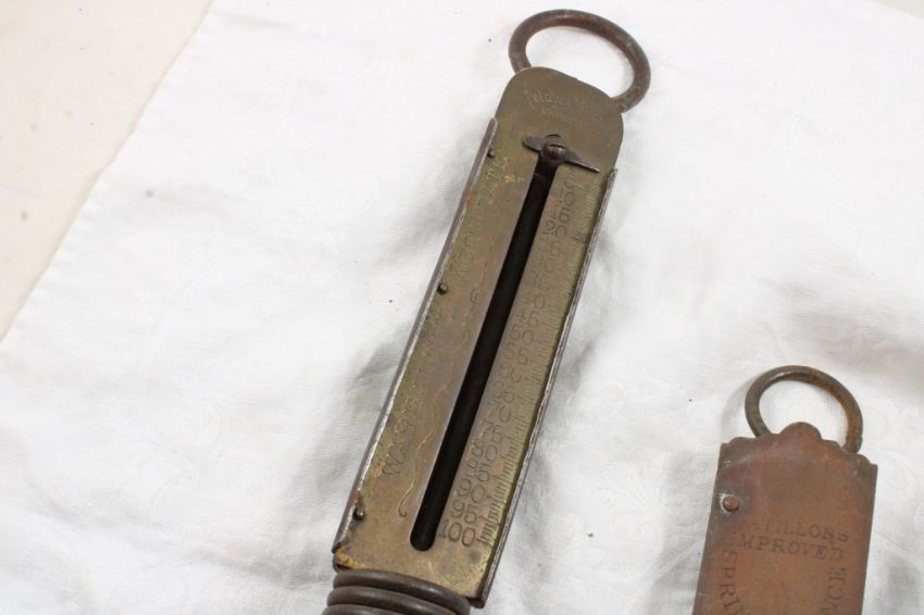 3 Antique Brass Spring Scales - Pelouze 100 Lb Scale, Foster's 24 Lb Scale, Chatillon's 24 Lb Scale. All as pictured. Please ask questions and read terms & conditions before bidding.