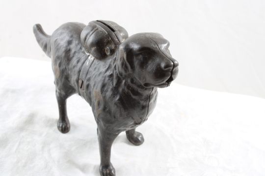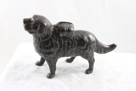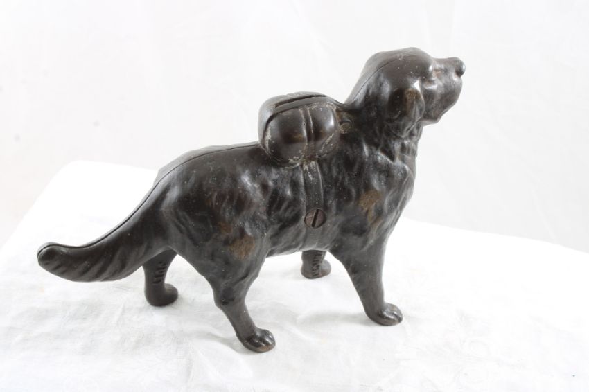 July 20 1900 Cast Iron St Bernard Dog Bank - Measures 5 1/2" Tall as pictured. Please ask questions and read terms & conditions before bidding.