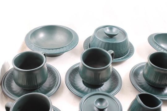 Red Wing Charstone Bleu Pottery - Includes 7 Cups & Saucers, Salt & Pepper Shakers, Cream Pitcher & Sugar Bowl, Oval Serving Bowl & Cereal Bowl all as pictured. Please ask questions and read terms & conditions before bidding.