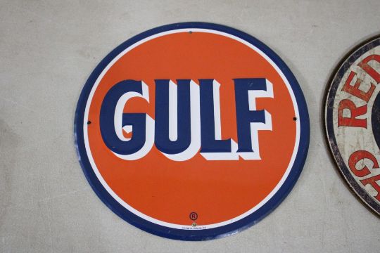 4 Gasoline & Oil Metal Signs - Sinclair Motor Oil 10 3/4" Diameter, Gulf 11 3/4" Diameter, Red Crown Gasoline 11 3/4" Diameter, Phillips 66 Gasoline 11 3/4" Diameter. All as pictured. Please ask questions and read terms & conditions before bidding.