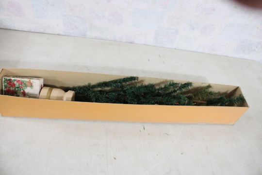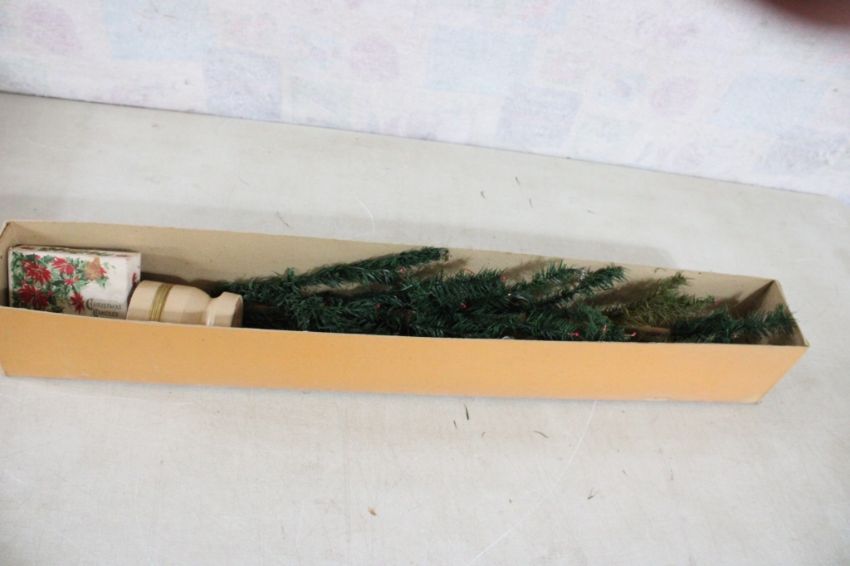 Antique German Christmas Tree w/Candle Lights - Measures about 3 feet tall in original box (water damage & faded label in English), with original candles in original box- slightly melted together. 2nd "row" from top is a slightly different color needles- possibly repaired. Plastic "needles", wood trunk, most branches have metal candle holders. Ceramic pot is marked Germany on bottom. The branches will need to be spread out. As pictured. Please ask questions and read terms & conditions before bidding.