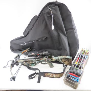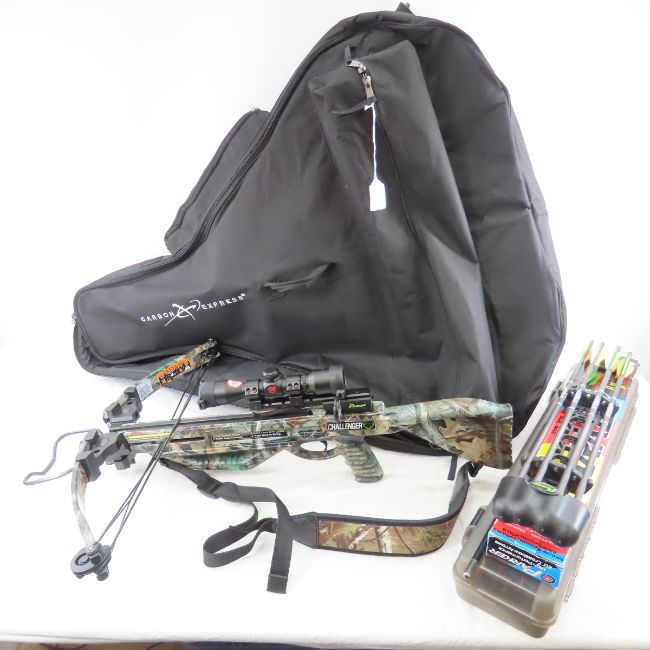 Parker Challenger Crossbow, scope, arrows and case - size 125-150#, string/cable 31.625"/22.875" SN# X4003-1073, Advantage camo, sling, Red Hot Scope, Carbon Express bag with assorted points, lube, mtn case-gard case with 6 Red hot bolts with target points, and 1 looseshaft, box of 5 Parker Arrows, Parker Quiver with 4 Carbon Express arrows with points Please read terms & conitions and ask questions before bidding.