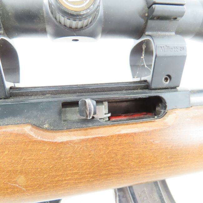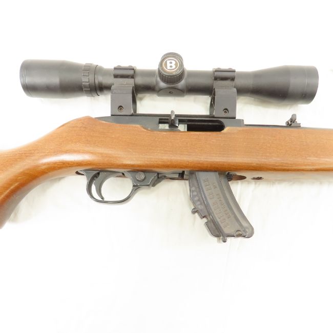 Ruger 10/22 Carbine .22 LR Rifle with Scope - 18" barrel (worn finish) with front and rear sights, wood stock worn near back of receiver, with pistol grip, SN# 254-71158, Butler Creek 25 round magazine, Millett mounts with Bushnell scope. FFL transferrequired. Please know local laws before bidding. Please read terms & conitions and ask questions before bidding.