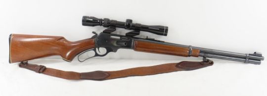 Marlin Mod. 336CS 30-30 Carbine Rifle with Scope - 20" micro-groove barrel with front & rear sights, .30-30 WIN, lever action, wood forearm, pistol grip wood stock with plastic medallion and butt plate, SN# 14035538. Leather Sling. Tasco 3-9x32 scope. FFLtransfer required, please know local laws before bidding. Please read terms & conitions and ask questions before bidding.