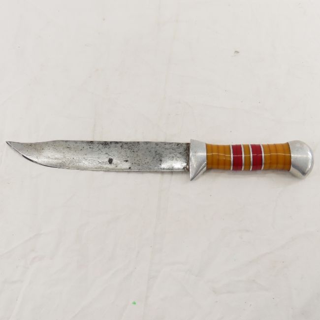 Unmarked Bowie Knife & Scabbard - banded grip, 8 1/4" blade and 13 1/4" overall, unmarked leather scabbard Please read terms & conitions and ask questions before bidding.
