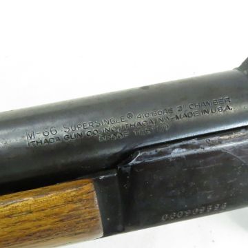 Ithaca M66 Super Single .410 Lever Action Shotgun-break action single shot, 26" barrel proof tested, front bead sight, 3" chamber, wood forearm, checkered wood stock missing sling mount, SN# 660969598, with soft bag, C&R or FFL transfer required, please know local laws before bidding. Please ask questions and read terms & conditions before bidding.
