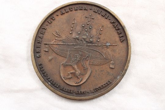 2 Commemorative Medallions - 1922 North River Insurance's Bronze 100th Ann. Medallion Paperweight is 4" in diameter. 1836 Prague Coronation Medallion Ferdinand & Maria Anna Augusta 3" Diameter. Both as pictured. Please ask questions and read terms & conditions before bidding.