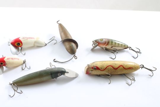 6 Vintage Fishing Lures Jitterbugs, Pflueger - Cisco Kid and other. All as pictured. Please ask questions and read terms & conditions before bidding.