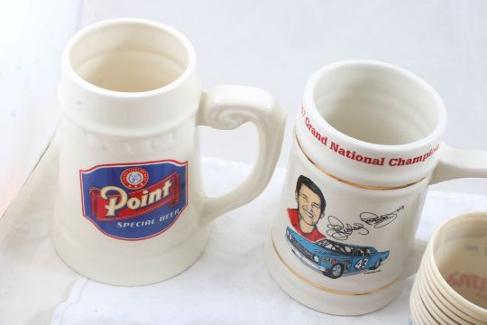 Hamm's Steel Side Beer Can Bank Pint & More - 2 Ruppert Knickerbocker 10 3/4" Large Coasters, 10 Hamm's Wax Beer Cups 4" Tall, 1960's Schlitz Oktoberfest Beer Stein, Budweiser XXIIIrd Olympic Games Beer Stein, Point Special Beer Pottery Stein, 1967Richard Pettey Grand National Champion Beer Stein. All as pictured. Please ask questions and read terms & conditions before bidding.
