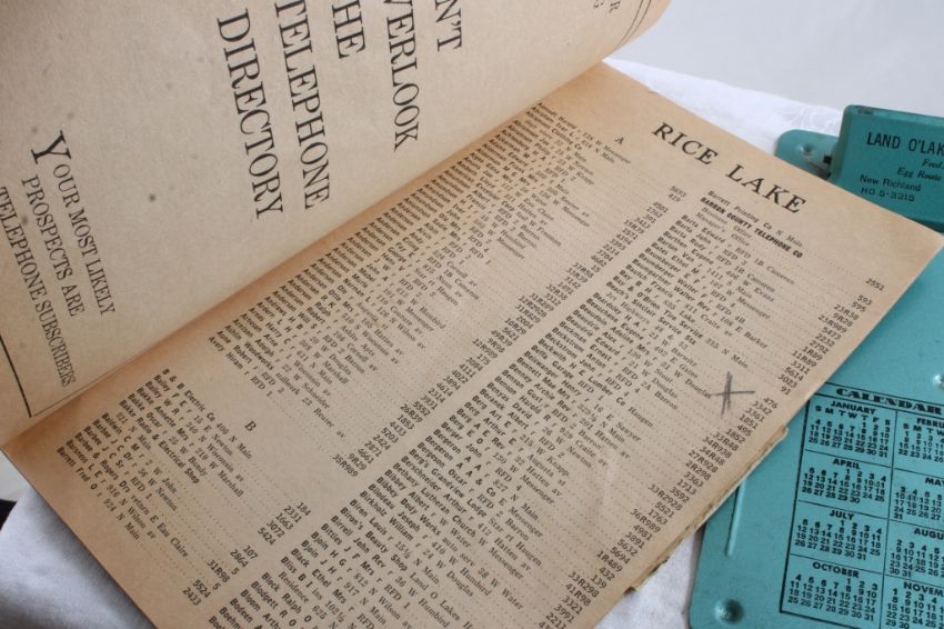 Land O'Lakes 1959 Calendar Receipt Holder PLUS - 1938 Rice Lake Wisconsin Telephone Directory (shows wear). Both as pictured. Please ask questions and read terms & conditions before bidding.