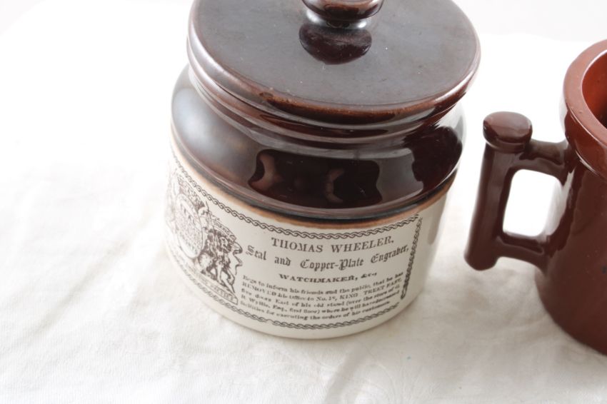 Advertising Pottery/Stoneware Jar & Mug - Thomas Wheeler Engraver Watchmaker Jar made in Canada measures 4" Tall and Collectors of Illinois Pottery & Stoneware 16th Annual Convention 3" Mug. Both as pictured. Please ask questions and read terms & conditions before bidding.