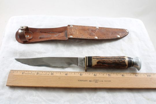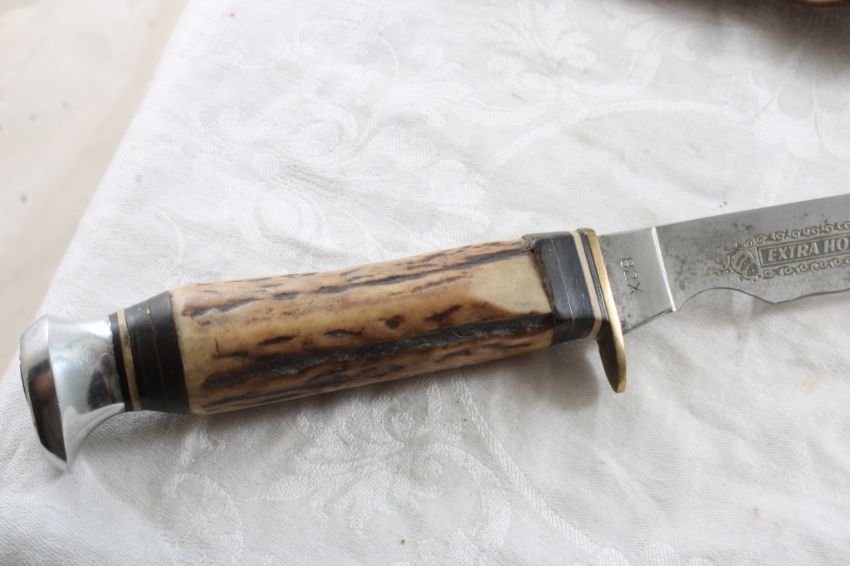 E C Solingen Germany 82X Fixed Blade Knife 9 1/2" - With Stag Handle & Stag Leather sheath Extra Hollow Ground. As pictured. Please ask questions and read terms & conditions before bidding.