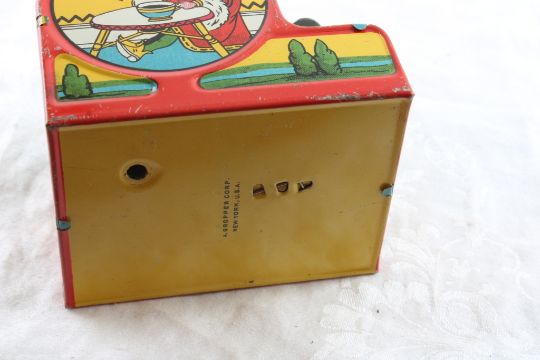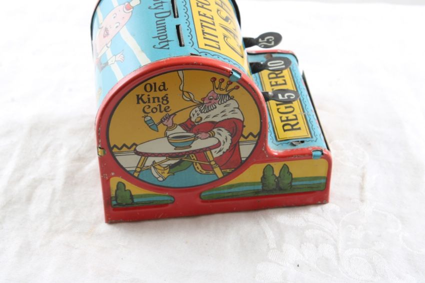 3 Tin Litho Banks Ohio Art, Kirchhof, A. Gropper - Tom - Tom The Piper's Son 4" Toy Bank by Kirchhof, Humpty Dumpty Cash Register 3 1/4" Toy Bank by A. Gropper Corp. of New York & Drum Bank 2 1/4" by Ohio Art. All as pictured Tin Lithos. Please ask questions and read terms & conditions before bidding.