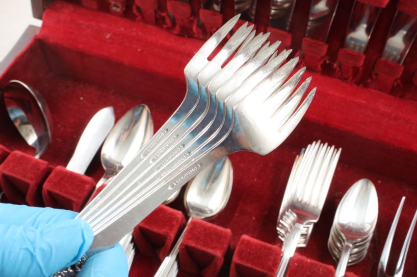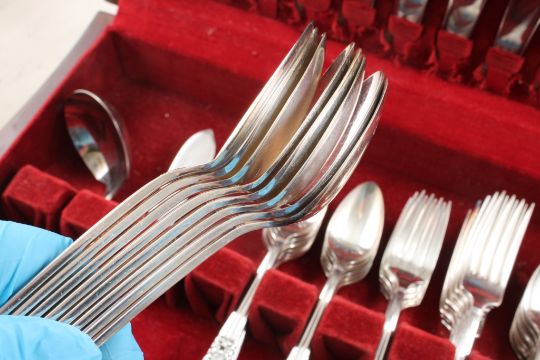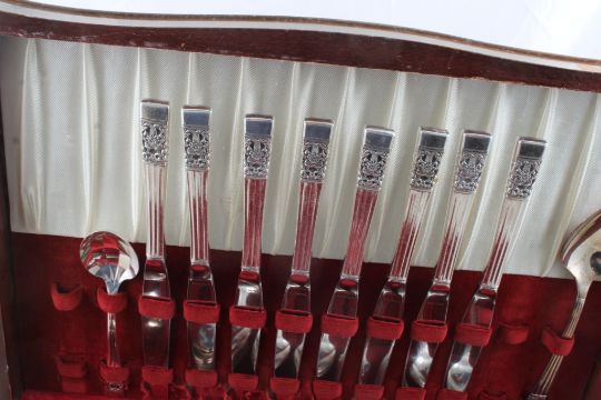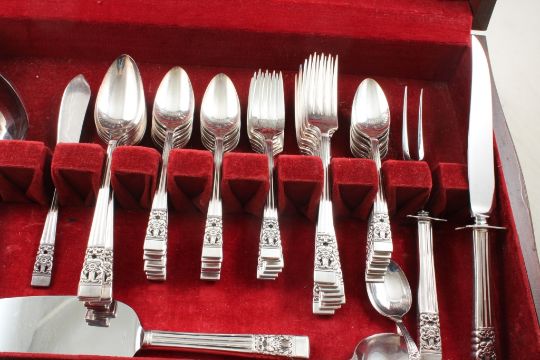 1936 Oneida Community Silverplate Flatware 60 Pc - Coronation pattern - 60 pieces in wooden case as pictured. Please ask questions and read terms & conditions before bidding.
