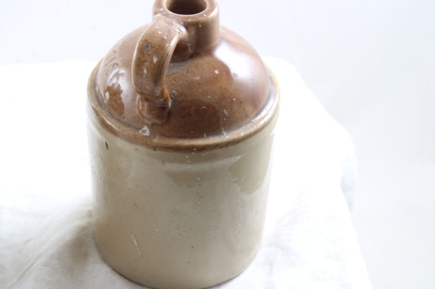 2 Stoneware Small Jugs 4 3/4" & 5" - McCormick Platte-Valley Straight Corn Whiskey Weston, Missouri measures 5" Tall and Fancy two tone Jug measures 4 3/4" Tall. Both as pictured. Please ask questions and read terms & conditions before bidding.