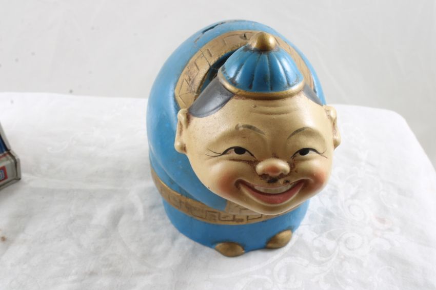 Chein Tin Litho Dime Bank, Asian Bobblehead Bank - Chalkware Asian Man Bobblehead Bank (been repaired) measures 5" Tall and J Chein Tin Litho Dime Bank both as pictured. Please ask questions and read terms & conditions before bidding.