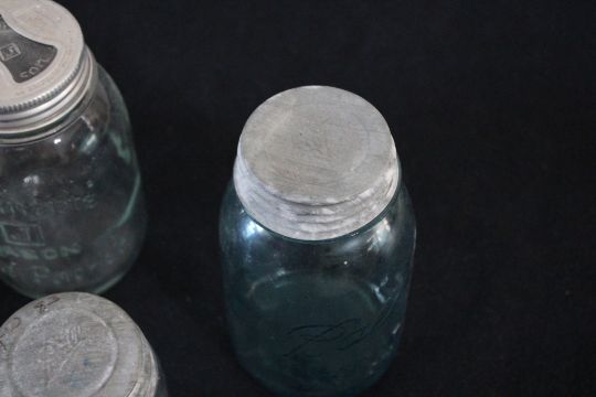 9 Fruit Jars 1/2 Pint, Pint, Quart, 2 Qt. Variety - Variety of Brands, Sizes & Lids. Kerr Self-Sealing 1/2 Pint, Ball Perfect Mason Pint (Clear), Ball Mason Pint (Aqua), Jeannette Mason Home Packer Quart, Ball Perfect Mason (Aqua) Quart, Kerr Self Sealing Wide Mouth Mason Quart, Atlas Whole Fruit Jar Quart w/Bail Lid, Plus Quart & 2 Quart (unmarked) patterned glass jars. All as pictured. Please ask questions and read terms & conditions before bidding.