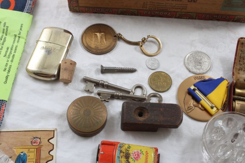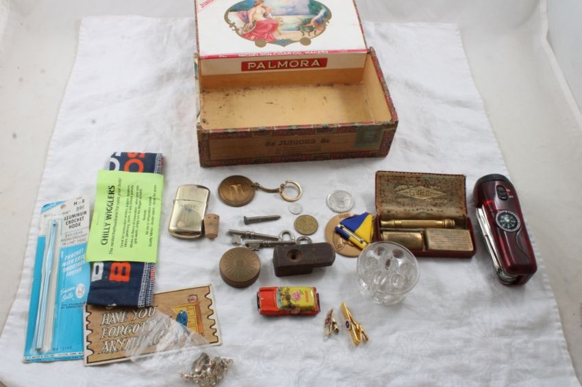Cigar Box, Lighter, Razor, Multi-Tool, Medallions - Skeleton Keys, Crochet Hook, Flower Frog, Tokens, Lighter is Camel, Razor is Gillette Gold with Blade case, All as pictured. Please ask questions and read terms & conditions before bidding.