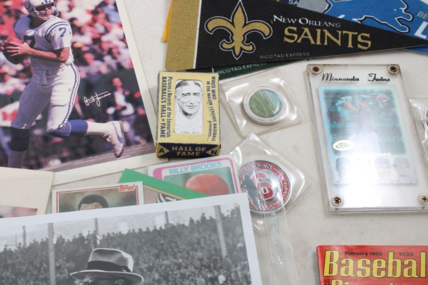 Sports Memorabilia Hockey, Football, Baseball - Signed Hockey Framed poster, Football Team Pennants, Pictures & records of the Immortals Baseball's Hall of Fame, Football mini posters, Cards, medallions, Baseball Digest, Photo George Halas Chicago Bears. All aspictured. Please ask questions and read terms & conditions before bidding.