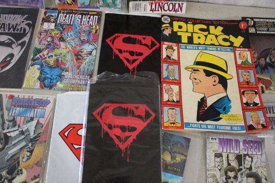 Dick Tracy Collectors Ed C-40 Comic & Others - Many action figure comics some sleeved, CD Sky Captain and the World of Tomorrow, 4 Super Hero Cards #2 Wild Seed, Seekers, Superman, Robocop, Star Trek Deep Space Nine & many more as pictured. Please ask questions and read terms & conditions before bidding.