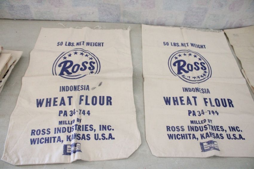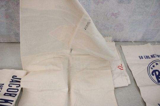 6 Advertising Flour and Seed Sacks - As pictured. Please ask questions and read terms & conditions before bidding.