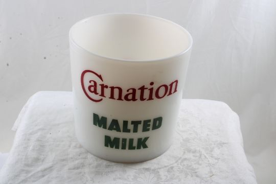 Carnation Malted Milk Glass Canister - No Lid. Measures 6" Tall as pictured. Please ask questions and read terms & conditions before bidding.