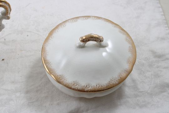 Majestic Porcelain Cream & Sugar, Dresser Jar - Cream Pitcher measures 3 1/2" Tall, Sugar measures 4 1/4" Tall and the Dresser Jar measures 5" in Diameter. All as pictured. Please ask questions and read terms & conditions before bidding.