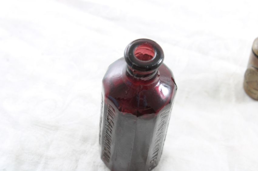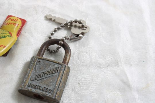 5 Vintage Advertising Smalls John Lennon Beatles - 1980 In Memory of a Great Beatle John Lennon Pocket Knife, Bass & Co. Pale Ale Advertising Brass Figural Bottle Match Holder, Poll Parrot Shoes Advertising Clicker, Slaymaker Rustless Padlock withKey, Colsom Johnson Richmond Virginia Apothecary Bitters 3" Bottle. As pictured. Please ask questions and read terms & conditions before bidding.