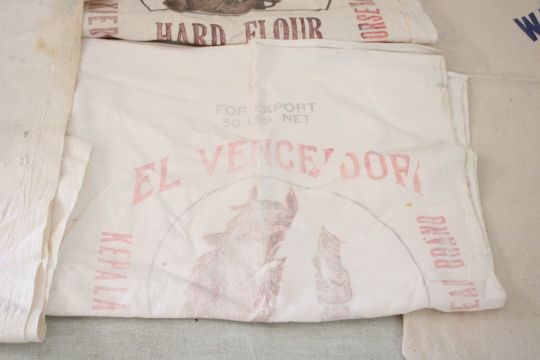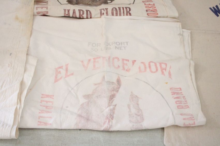 7 Advertising Flour Feed & Seed Sacks - Some may be cut open to make flat material as pictured. Please ask questions and read terms & conditions before bidding.