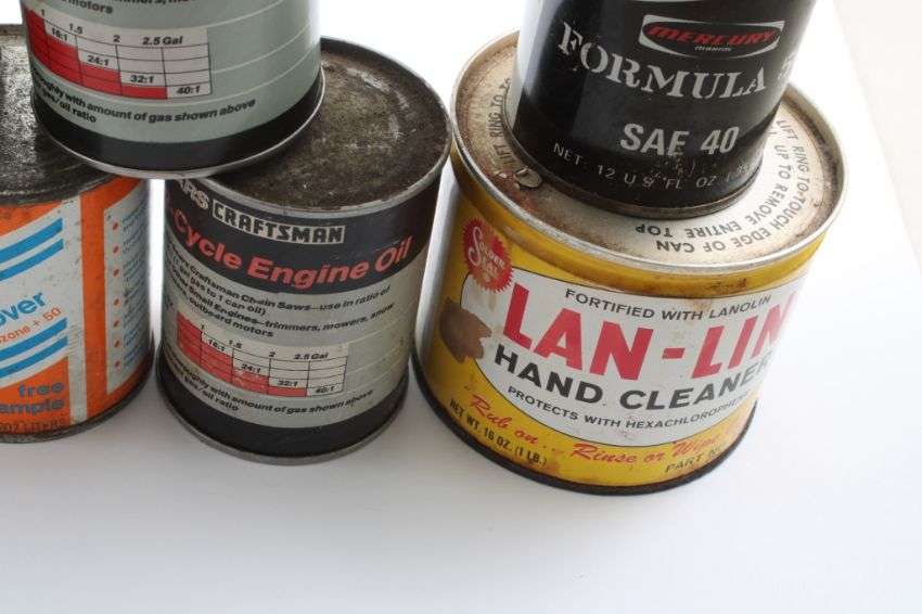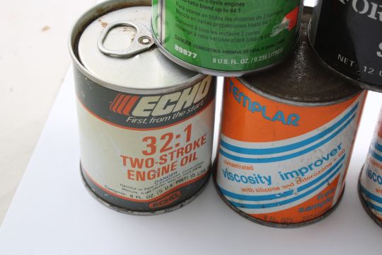 8 Advertising Cans - (2) QuickSilver 2-cycle Outboard Motor Oil, Lawn Boy 2 Cycle Ashless Oil, Lan-Lin Hand Cleaner, (2) Sears Craftsman 2 Cycle Engine Oil, (2) Templar Viscosity Improver, Echo 32:1 Two Stroke Engine Oil. All as pictured. Please ask questions and read terms & conditions before bidding.