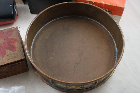 Glove Box, Shoe Shiner, Sieve, Temp Indicator - Wooden Ladies Glove Box, Brass U S Standard No. 120 Sieve - Opening 125 Microns, .0049 Inches, Leader Sparklers, 2 packages of fire crackers unopened, Simpson Temperature Indicator 385L, Shields Shine-O-Matic ShoeShiner. All as pictured. Please ask questions and read terms & conditions before bidding.