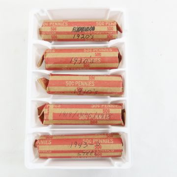 26+ Rolls of Lincoln Wheat Cents teens-30's - rolled by collector, only one labled 1950's, others 20's & 30's and partial rolls of teens and steel cents Please ask questions and read terms & conditions before bidding.