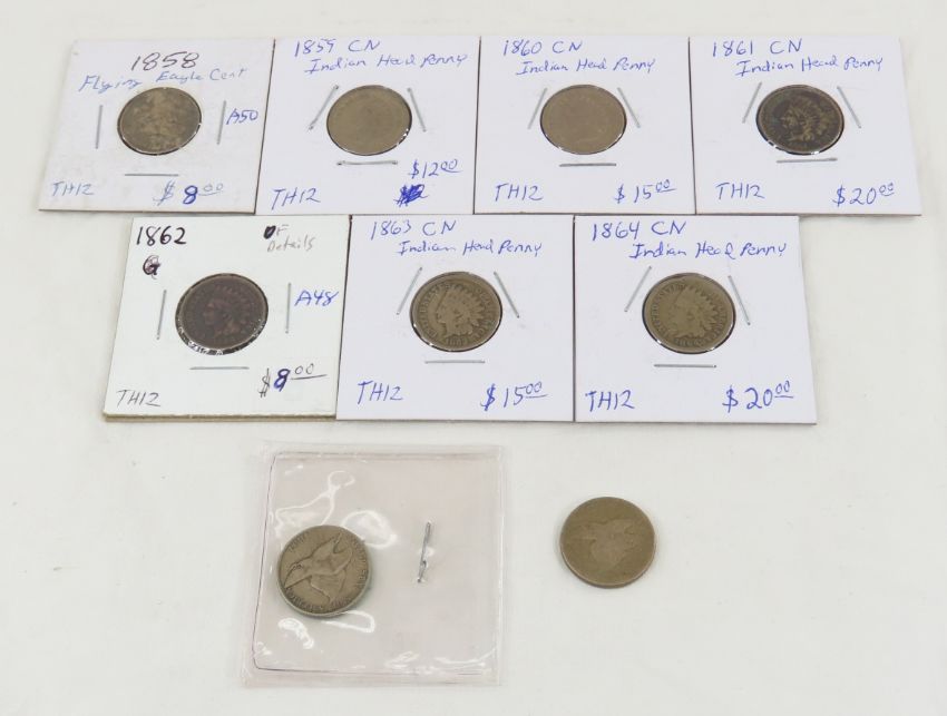 3 Flying Eagle & 6 Indian Head Cents 1857-1864 - 1857, 1858, & no date cull Flying Eagle Cents, 1859-1864 Indian Head Cents G or better grades Please ask questions and read terms & conditions before bidding.