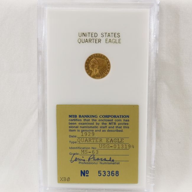 1929 $2.50 Gold Indian Head Quarter Eagle MS63 - MTB Banking Corporation graded in sealed plastic case with folder Please ask questions and read terms & conditions before bidding.