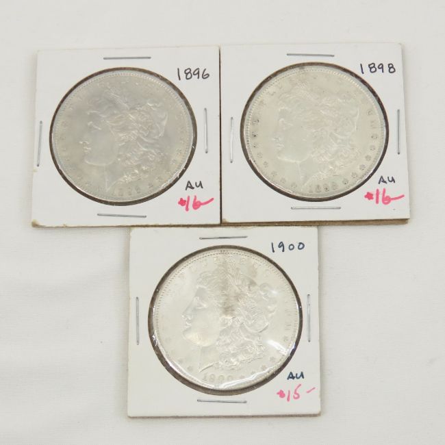 3 AU Morgan Silver Dollars 1896, 1898, 1900 - Please ask questions and read terms & conditions before bidding.