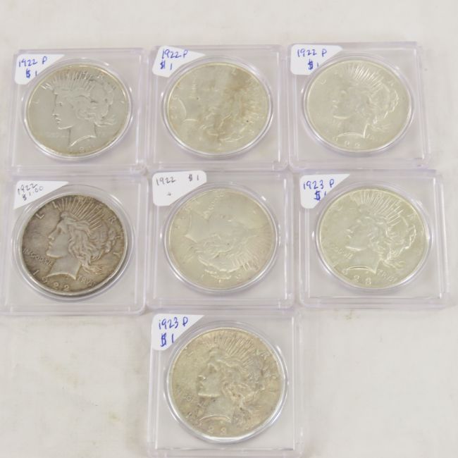 7 1922 & 1923 Peace Silver Dollars - Please ask questions and read terms & conditions before bidding.