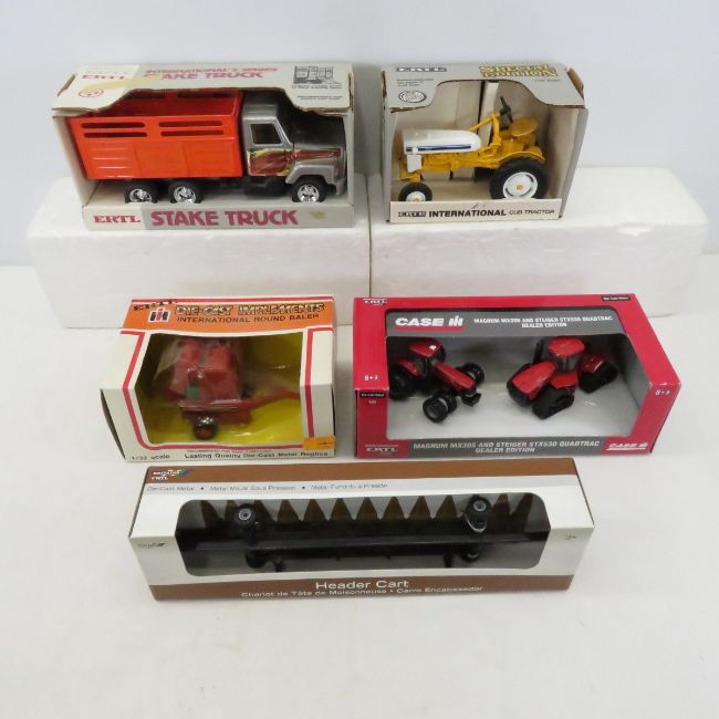 5 Various Ertl Die Cast Tractors, Truck and More - Ertl Magnum MX305 and Steiger STX530 Quadtrac Dealer Edition 1/64 Scale Die Cast Metal, International Round Baler 1/32 Scale, International Cub Tractor 653 1/16 Scale, Stake Truck 3610, Header Cart 12943, AllOpen-Face Boxes Please read terms & conditions and ask questions before bidding.